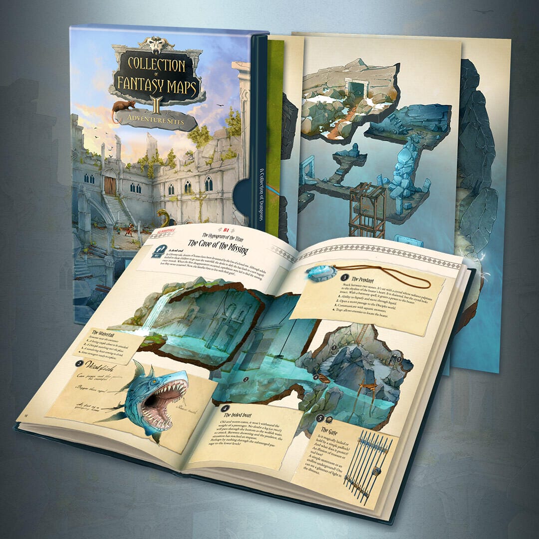Une fois n’est pas coutume, je vous propose aussi de jeter un œil à cet ouvrage, A Collection of Fantasy Maps II. Ce n’est pas un JDR, mais je voulais vous le présenter, car je suis tombée sous son charme ! Ce livre se veut une source d’inspiration pour vos parties, avec des donjons, des plans, bref des lieux d’aventure, « intégrables dans n’importe quel univers médiéval fantastique », selon l’éditeur. L’ouvrage offre de nombreux lieux, répartis au sein de 6 régions ayant chacune leur identité et leur ambiance, mais aussi des créatures, des objets et des secrets.