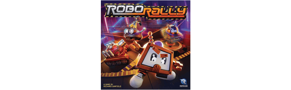 RoboRally est une course de robots imprévisible signée Richard Garfield où vous devez programmer vos déplacements en secret avec 5 cartes avant de lancer vos petits robots sur le plateau et ses nombreux obstacles. Plusieurs objectifs sont placés sur le plateau et vous devez faire naviguer votre robot jusqu’à eux dans un ordre spécifique. Vos cartes de mouvement peuvent par exemple vous permettre de tourner à 90 degrés d’un côté ou de l’autre, d’avancer ou de reculer de deux cases, etc. Le hic ? Vous avez beau tout planifier parfaitement, vous ne connaissez pas l’initiative des joueurs à l’avance. Bilan ? Votre robot peut croiser la trajectoire d’un autre, et là, qui sait où vous terminerez votre route (peut-être sur un tapis roulant qui vous ramènera à la case départ ?). Pour ajouter du piment, les robots tirent des lasers ! Si vous avez trop de dégâts, certaines cartes de mouvement deviennent fixes et ne peuvent plus être modifiées. Ça se corse !
