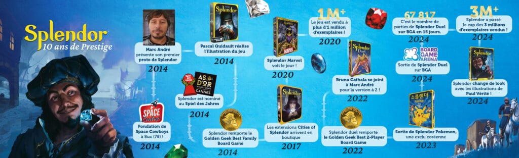 Il n’y a pas que Ludovox qui fête ses 10 ans en ce moment ! Chez Space Cowboys, c’est la sortie de Splendor le célèbre jeu de Marc André, qui fait la une de leur actu en ce moment. On apprend que le titre s’est écoulé à plus de 3 millions d’exemplaires à travers le monde, et qu’il n’a pas dit son dernier mot puisqu’il revient cet été avec un tout nouveau design signé Paul Vérité.