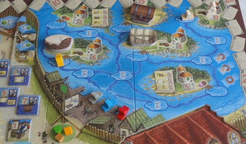 - des marchandises obligatoirement variées, car on ne peut pas embarquer deux fois le même élément sur son rafiot. Chaque marchandise est heureusement demandée sur au moins une île, à l’exception de la bière (puisque Le Port est jouable sans L’Auberge). Planification minutieuse de rigueur pour optimiser son itinéraire.