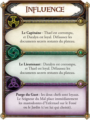 Au début de la quête, le Seigneur du Mal choisit entre plusieurs options. Cela aura un impact direct sur le reste de l'intrigue. Par exemple, admettons. Vous êtes le Seigneur du Mal. Oui, ça tombe sur vous, parce que vous êtes là, mais rien de personnel. Vous devrez choisir un petit jeton Influence qui correspondra à des détails importants de l'intrigue. Par exemple, si vous prenez le jeton vert, cela signifie que le Lieutenant Daralyn sera corrompu, tandis que Thael, lui, sera loyal. Si les joueurs devinent vos plans, ils gèrent leur pâté et peut-être s'en sortiront-ils sans trop d'encombres. Mais si vous les fourbez du début à la fin, là…