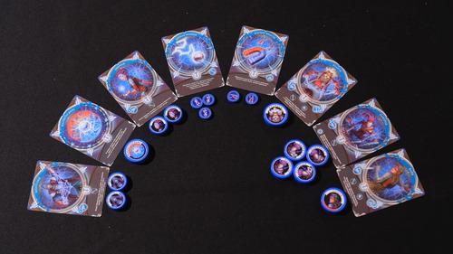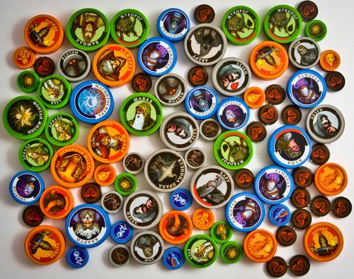 – les plus gros représentent les grands héros de votre armée (mais aussi les artefacts) les héros sont tous uniques et sont très robustes (si un héro se fait toucher, on met un jeton dégât sur sa carte correspondante) ;