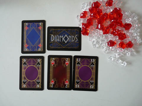 Bilan, Diamonds est un petit jeu qui passe plutôt bien. il y a un peu de stratégie et du hasard, l’ambiance autour de la table est celle d’un jeu de plis : on essaie des coups, on se fait avoir, on est content quand on prend le pli sous le nez du voisin. Pas la peine d’en attendre plus !