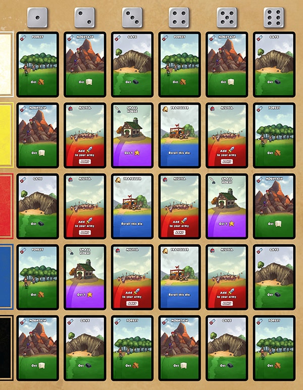 Voici notre plateau perso, il présente 5×6 cases présentant chacune une action (gain de ressources, de PV, d’armée), à notre tour on lancera les dés qui nous indiqueront quelles actions on pourra réaliser. Mais vous allez voir que c’est un peu plus riche que ça puisqu’on va pouvoir construire par dessus chacune de ces actions pour avoir accès à des effets plus intéressants, et il sera aussi possible de déjouer le couperet fatidique du lancement de dés !