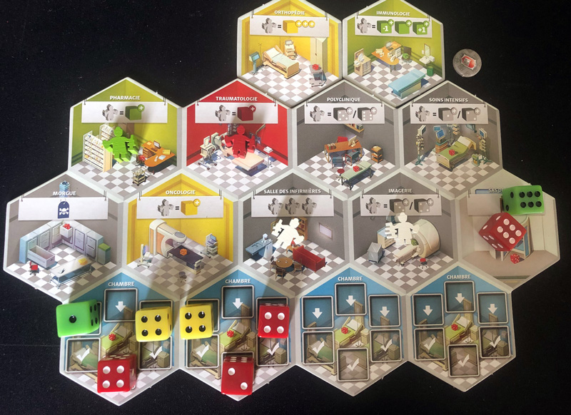Nos patients sont représentés par des dés de couleur et selon les salles de notre hôpital où l’on envoie nos infirmières, on soignera un dé rouge, vert ou jaune, à moins que l’on n’agisse sur une valeur. Tous ceux laissés sans soins déclinent (on réduira leur valeur de 1) en fin de manche, et s’ils descendent en dessous de 1 … oups !