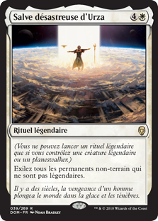 Le thème tout à fait avoué de cette extension – de ce bloc d’extensions, peut-on même supputer – est le permanent légendaire. Ce sous-type de carte existe depuis le début de Magic. Au lieu d’avoir des troupes anonymes et démons mineurs, on aura des dragons avec un nom, des chefs de guerre acclamés et des objets mythiques. Cela veut dire, en termes de jeu, que l’on ne pourra contrôler qu’un exemplaire de la carte en même temps. Cet état de fait permet de limiter des pouvoirs trop incontrôlables, mais diffuse également de l’histoire, du fluff. Et Dominaria, avec sa foule de cartes légendaires, vous oblige à y faire attention, et bouleversera probablement un peu la façon de jouer à Magic. En revanche, ceux qui s’adonnaient au Commander (mode de jeu avec des paquets limités à un exemplaire de chaque carte) s’en donneront à cœur-joie.