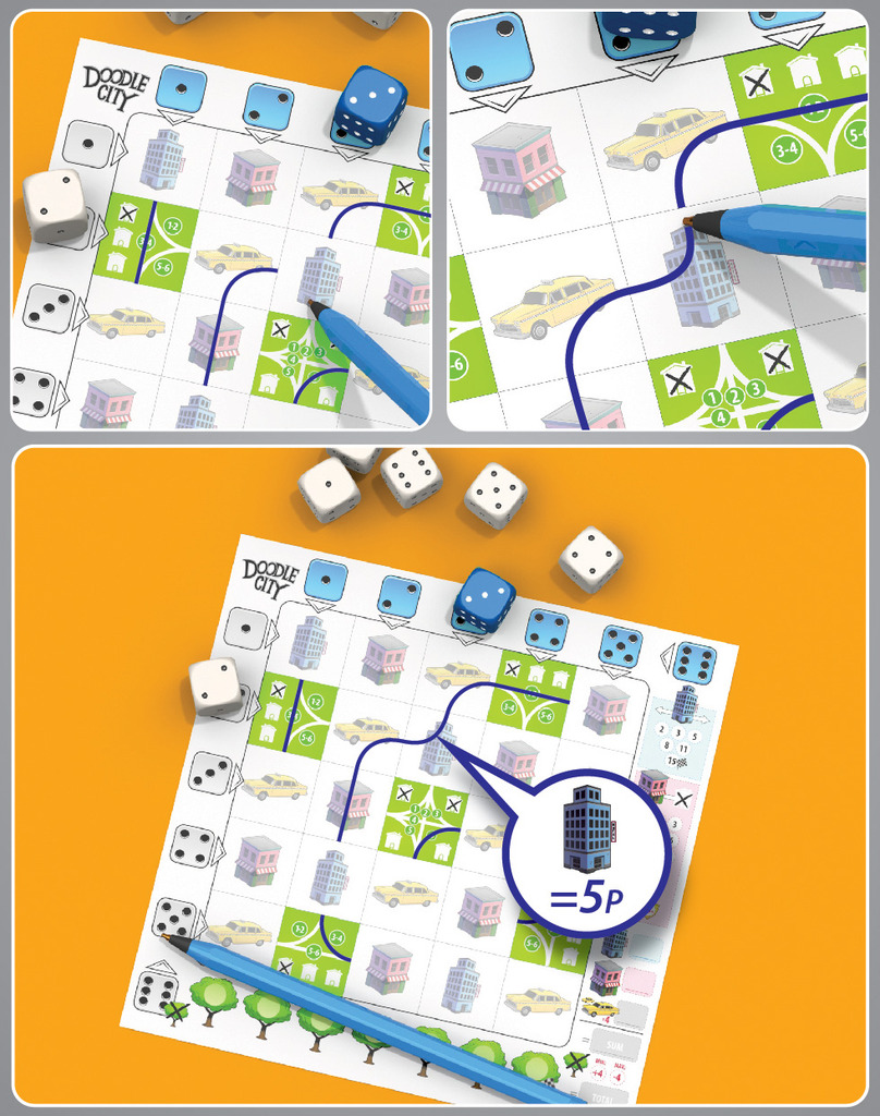 Doodle signifie griffonnage et c’est bien dans ce sens qu’il faut le prendre ici, bande de geeks. En effet, dans ce sympathique jeu de dessin et de dés, vous allez devoir tracer des lignes qui représenteront des routes entre des bâtiments. Facile ! Oui sauf que ce sont les dés qui vont décider (plus ou moins) de l’endroit où vous pourrez tracer votre coup de crayon.