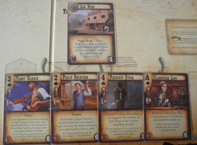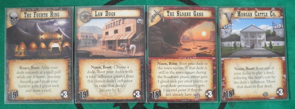 - Noon : la phase principale. On peut défier les dudes des autres, se déplacer, jouer des cartes (deeds, events, dudes, attachments) et activer des pouvoirs. Cette phase est particulièrement dynamique puisque chaque joueur joue une action à tour de rôle.