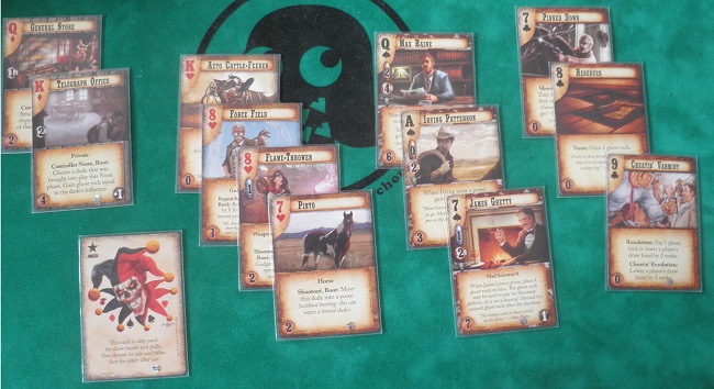 Les cartes sont divisées en six catégories : les outfits, les jokers (tous identiques), les dudes [gars], les deeds [lieux], les attachments [équipements] et les events [événements]. Chaque carte possède une valeur de jeu de cartes qui sert à pas mal de choses, un peu comme dans Wanted / Bang, on y reviendra bientôt. Bien entendu, un deck ne peut pas se passer de dudes ou de deeds – ceux-ci permettant de gagner la partie, il serait dommage de ne pas en profiter !