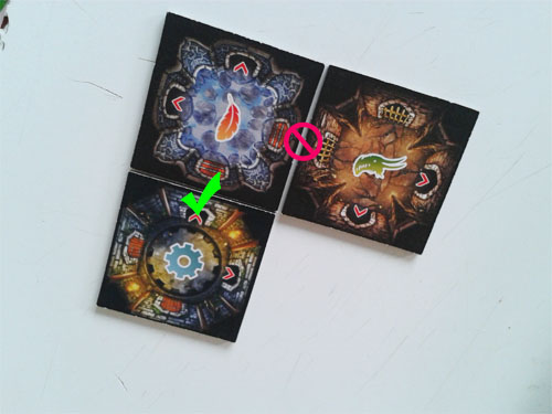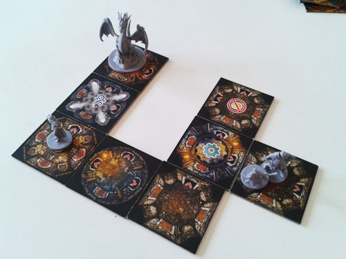 Dans Drakon ce sont les aventuriers qui construisent leur donjon. Chacun commence avec 4 tuiles qu’il placera, une par une, où il veut, de façon adjacente à une tuile déjà posée et en respectant la signalétique des flèches. Ces dernières limitent la possibilité de faire demi-tour (et ainsi abuser de avant/arrière/avant pour « boucler » dans une salle aux trésors par exemple et ramasser ainsi plein de sous en ne fichant rien).