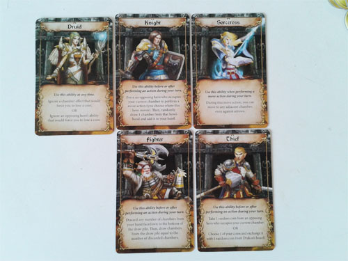 Les héros sont au nombre de 6, c’est aussi la configuration maximale de joueurs pouvant venir se perdre dans le donjon. On y trouve les archétypes classiques : le voleur, la sorcière, le ranger, le druide, le chevalier et le guerrier (Nain). Chacun à un pouvoir qu’il peut utiliser 1 fois par partie (c’est vraiment histoire de dire). Par exemple, le Ranger a un déplacement en plus, le guerrier peut défausser autant de salles de sa main pour en piocher des nouvelles… C’est vraiment pas foufou, mais bon, c’est toujours ça.