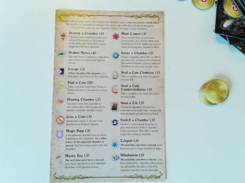 Oui, des pièges, et des tuiles spéciales, il y en a beaucoup. On peut presque tout faire : se téléporter, détruire des tuiles, jouer une action supplémentaire, faire pivoter une salle, perdre un or, voler un or, bouger un autre héros, faire demi-tour, voler une tuile, échanger des salles… Le but étant d’être le plus riche et le plus vivant aussi. Le jeu s’arrête quand un aventurier a acquis un certain total (8 ou 10 ou 15 si vous voulez traîner).