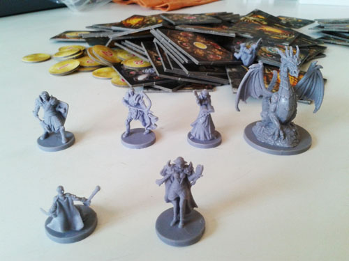 L’histoire du jeu commence en 2001. Drakon débarque alors avec une boite de moyen format et une formule simple, qui n’évoluera pas vraiment avec les années : 6 héros (en carton), 64 tuiles donjon et des pièces d’or.