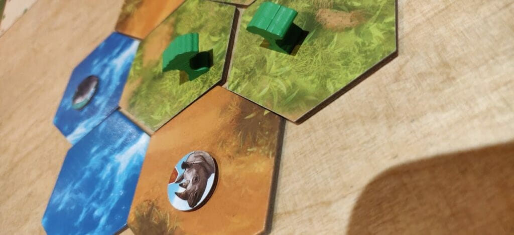 - Et surtout marquer des points de victoire, soit directs, soit en fonction de la configuration du continent ou de la pose préalable d’un jeton. Par exemple, poser un rhinocéros et gagner trois points par montagne adjacente.