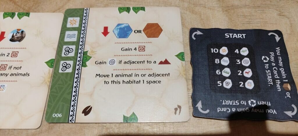 Les cartes vont proposer une suite d’actions, à résoudre dans un ordre défini. Cela commence, pour une majorité de cartes, par une action de placement : Placer une tuile terrain, avec parfois une contrainte de pose ; placer des arbres ou des montagnes sur une tuile existante, avec aussi des contraintes ; ou placer un type d’animal sur une tuile, en respectant sa contrainte d’habitat (soit par rapport à un terrain, soit par rapport aux arbres/montagnes). Jusqu’à 14 espèces d’animaux différentes pourront coexister sur le continent.