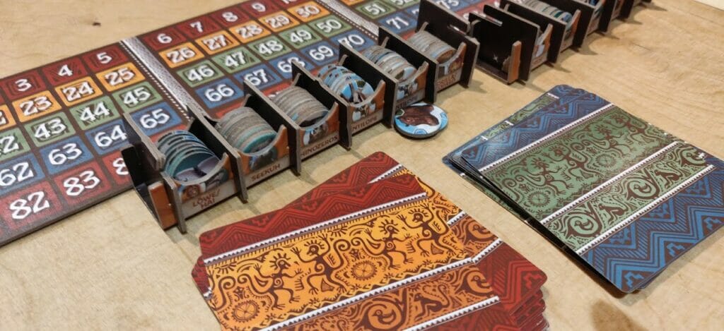 Ne vous y trompez pas. Ecos est un jeu qui se mérite. Au premier abord, on pense à un jeu un peu hasardeux, qui se définit selon le bon vouloir des jetons qui sortent du sac. Il n’est pas sans rappeler Augustus de Paolo Mori, jeu familial de 2013 qui est revenu dernièrement sous une nouvelle édition, Via Magica. Lors des premières parties vous entendrez les mêmes phrases : « Ah mais ce n’est toujours pas le jeton que je veux qui sort ! » ou « Ah, mais Michel a trop de veine, il réussit à remplir plein de cartes lui ! ».
