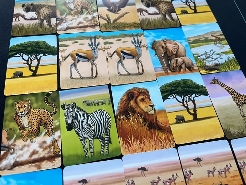 Le placement est plus subtil, il vaut mieux placer les vautours tout en haut de notre tableau, mais ils marqueront des points que s’ils ont des charognes au-dessous d’eux, ce qui implique qu’il faudra placer finement les prédateurs et les proies. Les hyènes doivent être à deux cartes de distance des charognes. Les éléphants rapportent des points (beaucoup) s’ils ne sont pas adjacents à d’autres espèces.