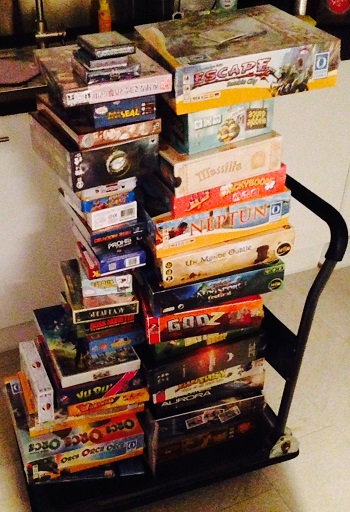 Le truc, c’est que les chefs nous ont rapporté une tour de jeux façon Jenga. C’est tout un pan de jungle allemande qui nous revient dans nos bureaux lyonnais. Une tower of doom qui me fait saliver et qui me terrorise par avance. Vous n’imaginez même pas. J’ai l’impression qu’ils vont me submerger de jeux, m’en faire manger au petit déjeuner, me taper à coup de boîte d’Agricola si je ne lis pas assez vite les règles de la pile.