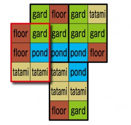 – Des cartes de Construction qui sont divisées en une grille, et chaque case de la grille représente soit un sol, soit un tatami, soit un bassin soit un jardin.