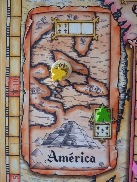 Concernant l’Amérique, on y trouvera des jetons or qui donneront 6 points à leur propriétaire, une fois ramenés au Pays.