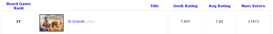 De temps en temps, j’aime bien jeter un œil sur le classement BGG afin d’obtenir des avis différents de ceux qu’on peut avoir sur les sites francophones dédiés à la chose ludique, car il est important de multiplier les points de vue et les sources d’informations. Cela permet notamment de cibler d’autres opus à côté desquels on serait malencontreusement passé. Ce jour là, j’ai pu m’étonner de voir que El Grande, un vénérable ancien de 1995 tout de même, conservait une place de choix dans le cœur des joueurs.