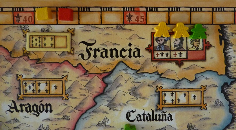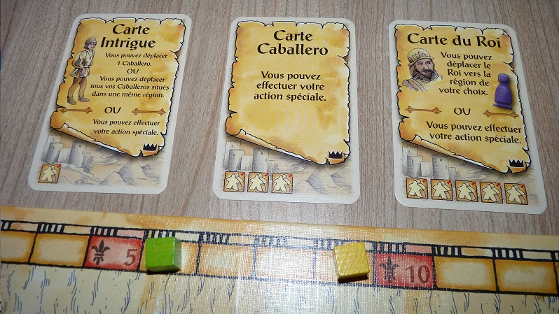 Lors d’un décompte, en plus des points obtenus pour la majorité, le joueur possédant une de ses troupes sur la case de l’Ambassadeur marquera deux points, et celui dont le caballero occupera la case de l’Emissaire marquera un point. Il sera donc impératif de bien se positionner en France dès le début de partie.