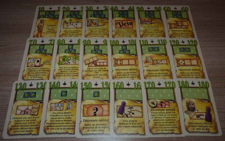 Sur celles-ci, en plus de sa valeur, est indiqué le nombre de caballeros que vous aurez le droit de transférer de votre province (stock général) à votre cour (stock disponible), sachant que seuls vos troupes en attente dans votre cour pourront être envoyées sur le plateau.