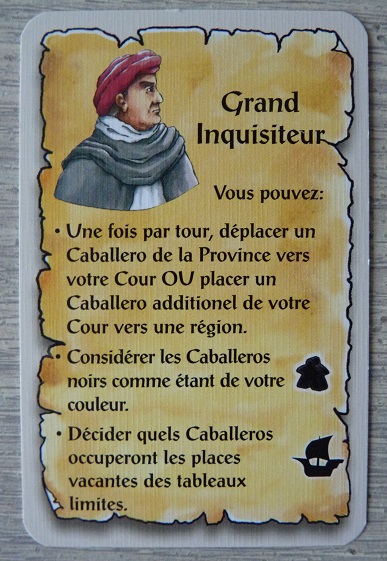 Une de ces cartes est celle de l’inquisition : elle permet de s’emparer du rôle de Grand Inquisiteur jusqu’à ce qu’un adversaire prenne à son tour la carte action correspondante. En plus de certaines capacités, ce rôle permet surtout de considérer les caballeros noirs comme les siens : parfait pour trancher les égalités en sa faveur ou se démarquer de ses concurrents dans la course à la majorité !