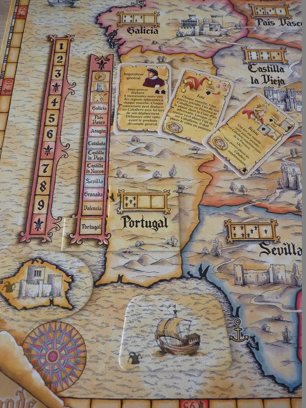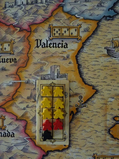 Lorsque le Roi est sur une province côtière, un joueur peut envoyer ses caballeros sur le Navire. Ceux présents depuis la fin de la manche précédente pourront être déplacés, gratuitement et donc sans utiliser de déplacement donné par sa carte action, vers l’Amérique, l’Afrique ou une région côtière de l’Espagne (ou même en France) : utile pour mettre ses troupes en attente d’un retour sur la péninsule Ibérique, mais pas que… en effet, l’accès aux régions lointaines nous permettra (peut-être) d’acquérir des jetons de marchandises ou d’or.