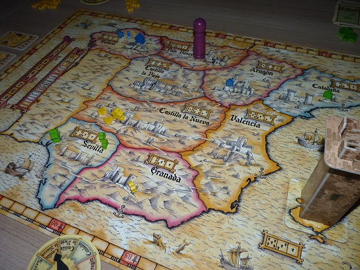 Le joueur vert s’est emparé de la place de Capitaine, alors que le joueur jaune transporte des jetons vers l’Espagne.