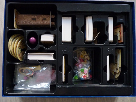 Ce petit problème réglé, on découvre des fascicules de règles bien rédigées (même s’il est toujours un peu fastidieux avec les extensions de devoir se référer à plusieurs livrets), des paquets de cartes, des sachets vides, du matériel à dépuncher (voire à assembler), et un sac rempli de meeples (et d’un objet à caractère non conventionnel qui s’apparente à un… Roi). On est, par ailleurs, étonné de découvrir un mode d’emploi pour le rangement du thermoformage..!