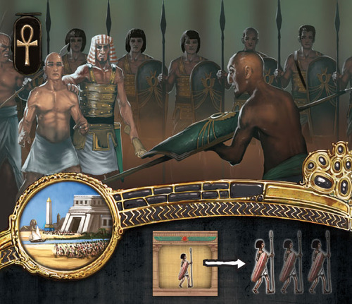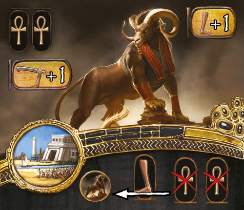 • Module 3 : Un nouveau mécanisme, le chemin vers Ta-Seti. Voilà un nouveau plateau où vous mettrez les figurines Prêtre des joueurs. Sur ce plateau, plusieurs petits chemins mènent vers divers jetons positionnés sur des espaces (ville, village, temple). Désormais quand vous choisirez l’action déplacement/combat, vous pourrez activer un de vos prêtres sur ce plateau annexe. Vos prêtres vont donc pouvoir progresser sur le(s) chemin(s) (toujours vers la droite), profiter de la vue et des effets du voyage, et faire étape sur des emplacements pour bénéficier de leurs récompenses (jeton objet, compétence, point de victoire tout à droite).