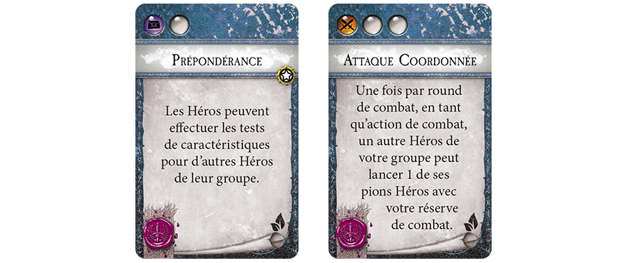 Concrètement, vous pouvez former un groupe, si vous êtes rassemblés sur la même case, vous pourrez vous déplacer ensemble pour parcourir plus vite les terres du royaume. Mieux que ça, les héros vont bénéficier de compétences de groupe, telles que « attaques coordonnées » ou « prépondérance » visibles ci-dessous :
