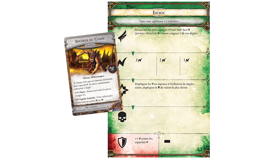 Un autre élément fait son apparition, le tableau de combat, qui change selon l’adversaire que vous affrontez (guerrier, mystique, sauvage, ou escroc). Chaque ennemi a son propre lot de jetons, et quand vous vous lancez dans une bataille, vous jetez les pions correspondants avant de les disposer dans les cases idoines du tableau. Quand l’ennemi doit jouer, vous résolvez ses actions en suivant l’ordre de lecture du tableau. Voici le tableau de l’escroc :