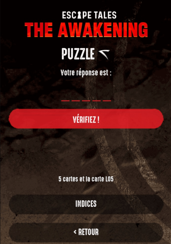 Vous résoudrez des énigmes sur une appli (bon, un site web, mais ça se consulte aussi par téléphone, n’est-ce pas). Chaque énigme utilise des cartes (une, plusieurs, à vous de le déterminer), et se solde par une combinaison à base de chiffres et/ou de lettres. De quoi casser la routine d’une mécanique trop redondante issue des systèmes mécaniques fixes (Exit et ses trois chiffres, Unlock et ses additions). Face à l’application, on a un certain nombre de caractères (disons six, mais cela pourrait être trois ou dix) à remplir et à faire valider. S’agit-il d’une séquence numérique, d’un mot ? À vous de le découvrir, la compréhension des termes de l’intrigue étant souvent une bonne part du boulot.