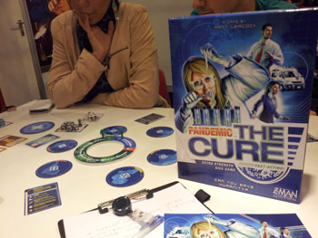 Nous reprenons notre habit de sauveurs du monde en nous décalant de 2m pour sauter sur une table de Pandémie le remède cette fois ci !