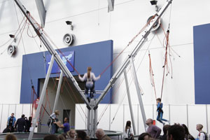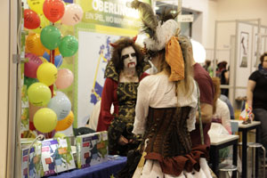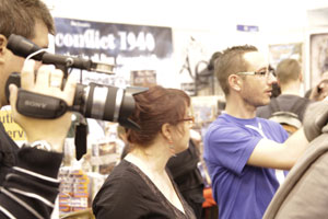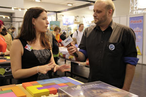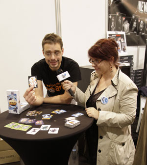 Nous avons enfin quitté le hall 3 pour aller faire un tour dans le hall 4, qui est plutôt un grand et vaste couloir il faut bien le dire ! Mais il y a ici des petits éditeurs qui présentent soit des choses totalement loufoques (le jeu biblique sur Jesus Christ faisant son buzz à sa façon, ou ce drôle de jeu qui se joue avec les pieds – « tu veux pas l’interviewer avec le micro entre les pieds ? » « Mais oui bien sûr… »), soit des choses très intéressantes mais chez des petits éditeurs qui n’ont pas (pas encore) pignon sur rue (ou pignon sur le hall 3 pourrait-on dire) – à moins qu’ils ne se retrouvent là parce qu’ils s’y sont pris à la dernière minute. Et oui, le passage ici est nettement moins intéressant, le hall plus petit mais plus bruyant, mais bon, ça permet tout de même d’être là.