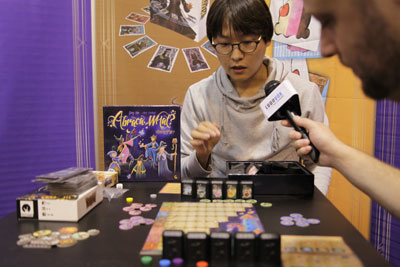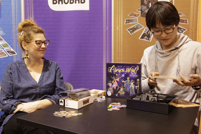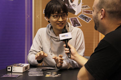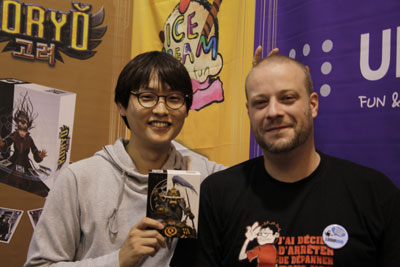 Nous avons commencé par une belle rencontre, avec un certain Gary Kim (Souk, Choson, Le lièvre et la tortue, 7 kingdoms, Abraca… What ? pour citer ses nouveautés…). Le jeune homme a du succès et des idées, mais il demeure hyper accessible. Une certaine Marie Cardouat – dont Gary n’a cessé d’encenser le talent – est également venue nous écouter lorsqu’il a présenté Abraca…what puisqu’elle en a réalisé les illustrations bien sûr (le jeu est d’ors et déjà sorti chez Korea Boardgames). Vous pourrez bientôt voir nos interviews, patience !
