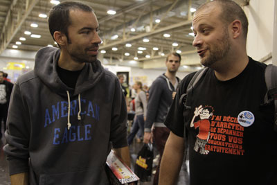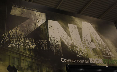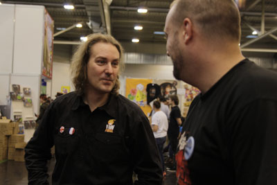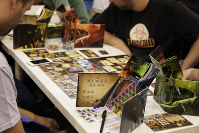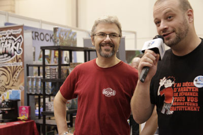 A gauche, un des co-auteurs de Zombie 15′ : Nicolas Schlewitz, à droite le stand de Flatined qui présente le jeu Robin
