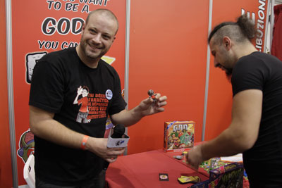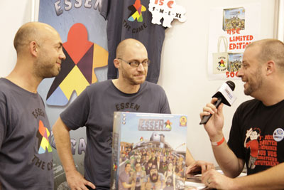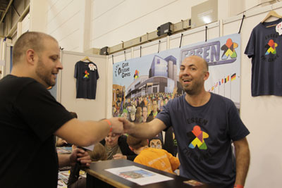 Nous avons aussi fait l’interview des belges de Essen the game qui rêvent déjà à la suite des aventures avec, pourquoi pas, un Essen the Game 2015, et nous avons finalement rencontré les braves de Morning Games qui vont sortir Euphoria en français, et également produire le maitre de la 6e dimension qui va sortir sous le nom de HOPE via Kickstarter. L’auteur, Olivier Grégoire, est plein d’énergie en cette fin de salon et c’est fort louable ! Interview très intéressante à venir…