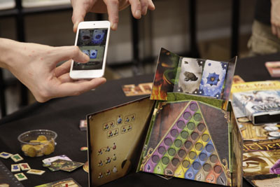 Alchemists a en effet pour lui un look ultra sexy, un thème traité non sans humour, une méca de pose d’ouvriers bien huilée et une appli qui apporte un vrai « truc » en plus avec son système de déduction. Si vous voulez savoir de quoi ça parle, allez voir par ici, j’avais commencé à vous en parler pas mal. L’application va générer des combinaisons pour tous les ingrédients des potions à chaque partie, elle va surtout permettre de tester une potion, de vérifier ses théories, bref elle permet de cacher les informations clefs dans le déroulement du jeu et ce, à tous les joueurs, autrement dit sans avoir besoin qu’un joueur fasse le maitre du jeu. En plus, on a juste à scanner les cartes pour avoir les informations, et hop l’appli répond à nos interrogations.