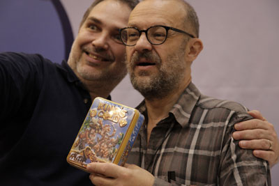 Nous avons ensuite croisé Ilopeli autour d’une version surdimensionnée de Korrigans (coédité avec Matagot) et avons réalisé une interview de Arnaud Urbon qui nous un peu présenté ce jeu qui s’avère être un bon familial (signé Arnaud Urbon & Ludovic Vialla, et joliment illustré par Olivier Fagnère qui était présent pour dédicace).