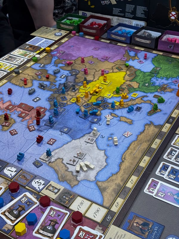 Difficile de se frayer un chemin vers une table d’un jeu euro aujourd’hui. Rien d’étonnant en fait. Les joueurs intéressés ont déjà réservé leur table pour une séance de présentation ou découverte. Deux points à noter, et ceci est vrai pour tous les festivals grand public : le peu de tables disponibles pour les jeux euro lourds, et des parties tronquées, c’est compréhensible, la place coûte cher, et il impératif que de nombreux joueurs puissent découvrir les mécaniques. Contrairement à tous les autres festivals ludiques, Essen s’accompagne pour moi de quelques rituels, habitudes, joies.
