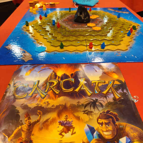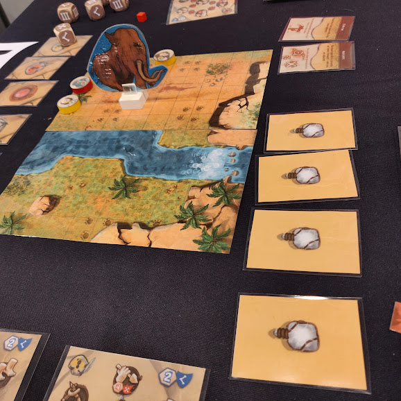 Le positionnement de départ ressemble au hall d’ouverture d’Essen avant ouverture des portes. Tout le monde va se précipiter pour arriver le premier sur les tables de jeux sur les bateaux. Chaque joueur aura 7 points d’action pour avancer ses autochtones, et ainsi se faufiler, pousser les autres, sauter par dessus un obstacle, … La thématique est très présente et, même si ce n’est pas le jeu du salon, j’ai bien aimé diriger mes pauvres personnages (ayant chacun une capacité spéciale), avant qu’ils ne se fassent happer par le brouillard, même si quelques éléments de gameplay m’ont gêné (interdiction de pousser un personnage adverse vers l’arrière. Oui, c’est fourbe. Et alors ?!).
