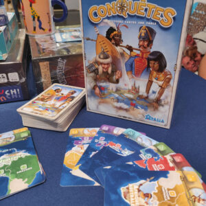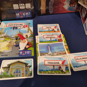Un petit tour chez Atalia avec le sympathique Cesare Mainardi m’a permis aussi de découvrir d’autres nouveautés à venir, comme Oucédonc, un carton en Allemagne depuis 16 ans, qui permet, un peu à la manière d’un Timeline, de replacer les villes de France selon leur longitude/latitude. Et je ne suis pas très bon en géographie…! J’ai pu voir Conquêtes : premier jeu édité de Cesare, reproduisant les sensations d’un Risk en jeu de cartes mais bien plus rapide dont Ludovox vous parlait en détail par ici. Et Histoires 100 fins : un jeu où l’on va raconter des histoires au fur et à mesure que l’on pioche des cartes, sur une thématique pirates ou policier, mais en compétitif car des cartes vont se rajouter et s’enlever. Il faudra donc s’en souvenir pour reconstruire une autre histoire sans se tromper.