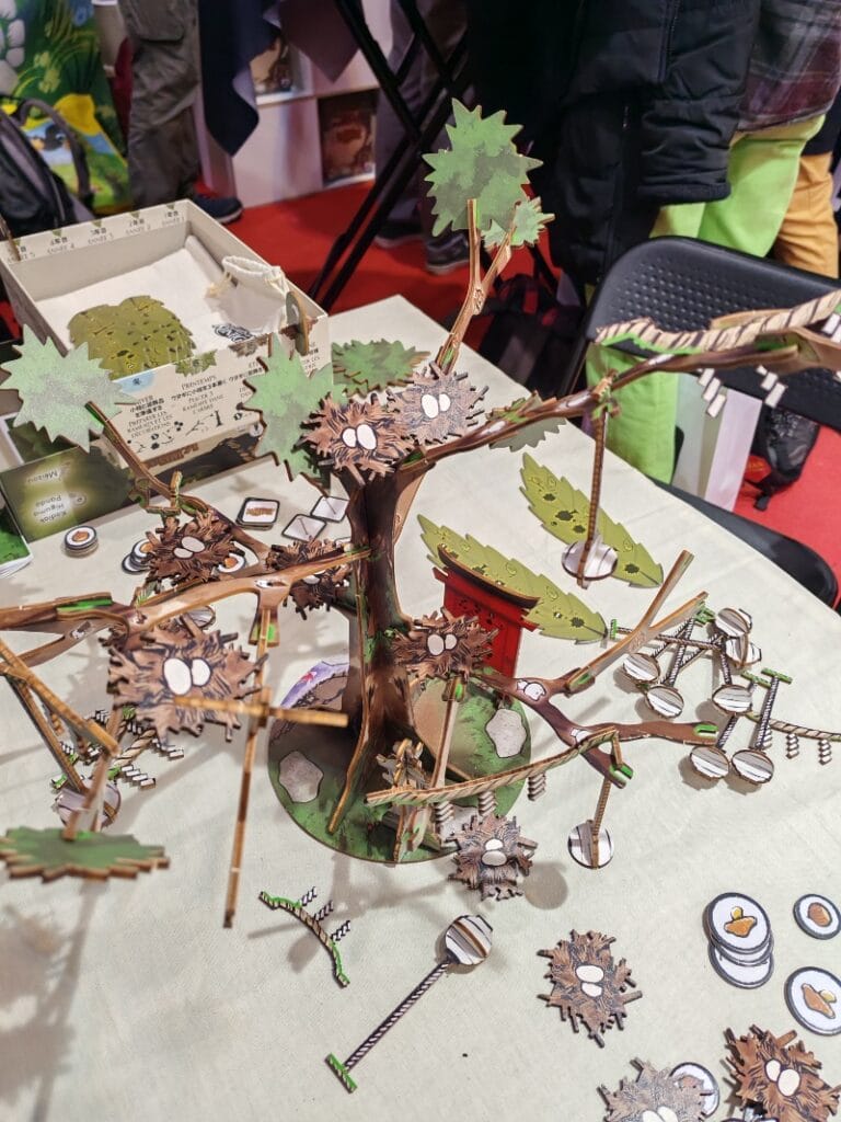 J’ai été très surpris d’apprendre que celui-ci était déjà en vente en France depuis un moment, pourtant Atom en parlait dans ce Just Played. Issu d’un Ulule, Tales of Kunugi est un jeu qui attire en premier lieu par son esthétique et son matériel unique. En effet, un énorme arbre en bois trône au beau milieu de la table. En tant que Kodama, vous devrez coopérerez pour remplir au mieux les objectifs de tous les joueurs autour de la table. Mais attention, seul l’objectif public est visible, le reste est caché. Vous devrez faire en sorte de faire comprendre aux autres ce que vous souhaitez.
