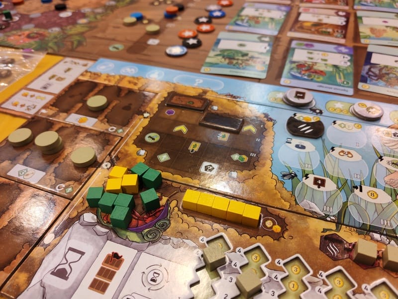 Graphiquement on est clairement dans la veine des Rats de Wistar. Par contre niveau gameplay c’est très différent. Nous avons pu faire une partie complète ce qui nous a permis de voir ce que le jeu a dans la fourmilière. Il s’agit clairement d’un jeu expert qui va vous demander plus d’une partie pour bien comprendre comment le maîtriser. Les règles ne sont pas si compliquées, mais il y a énormément de choses à faire, d’icônes à connaître, de combos à enclencher, de subtilités à bien avoir en tête. On est un bon cran au dessus des Rats en terme de richesse de jeu. C’est beau, c’est intéressant, c’est très généreux, y a beaucoup de mini mécanismes par-ci par-là mais… qu’est ce que c’est mécanique. À aucun moment je n’ai eu l’impression de jouer des fourmis et de développer une fourmilière. Du coup, sans pour autant m’ennuyer j’ai trouvé ça long (surtout que la personne qui nous expliquait n’était pas forcément au point sur les règles et les icônes). J’en attendais peut être trop mais je suis passé complètement à côté. Les autres ont quant à eux bien aimé.