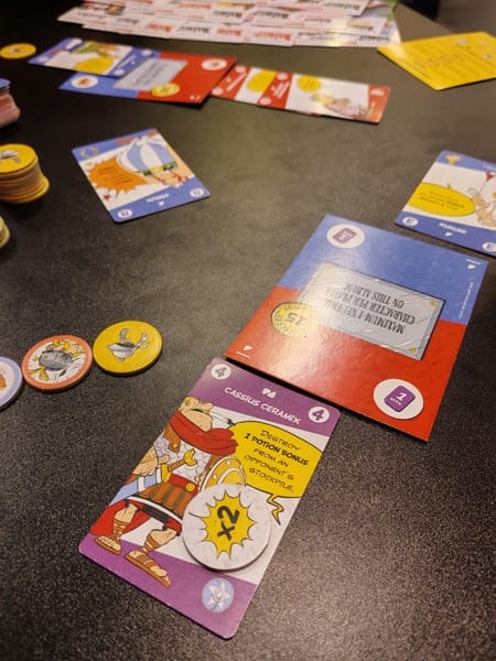 On retrouve la potion magique, les poissons frais, les sesterces et sangliers, et chaque carte personnage dispose d’une capacité. Le jeu n’est pas mal, avec un thème un peu plaqué, mais ils ont fait un travail sur la cohésion des cartes et leurs capacités. C’est assez mécanique, mais on retrouve bien les les différents personnages de l’univers.