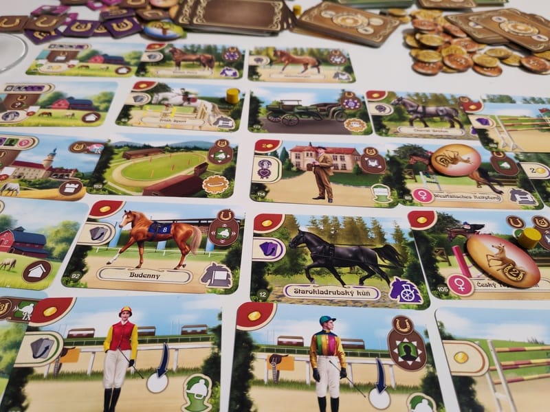 Vladimír Suchý nous offre cette année un jeu dans l’univers équestre. Il s’agit d’un jeu de cartes de 1 à 6 joueurs où vous allez devoir créer un tableau-building pour devenir le meilleur centre équestre des années 1920. L’originalité du jeu vient de son système de sélection de cartes. Vous pouvez en effet choisir de jouer en mode « chacun dans son coin » ou en mode « haute interaction ».