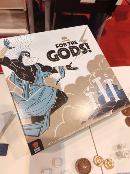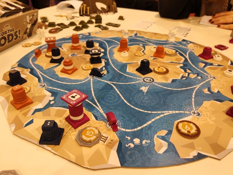 Encore à l’état de proto (même si fortement avancé), le jeu est prévu sur Kickstarter en février 2026. Que vous dire, mis à part qu’il est génial ? Le jeu vous plonge dans la Grèce Antique. À l’aide de votre petit bateau, vous allez devoir élever des temples dans les différentes villes. Pour cela, vous allez piocher dans un sac des colonnes qui vous serviront à vous déplacer, à vous installer ou à augmenter la force d’un temple déjà présent. Il faut aussi compter sur la présence des dieux. Vous allez pouvoir récupérer des pions divins qui vous permettront de gagner des capacités si vous leur dédiez des temples.
